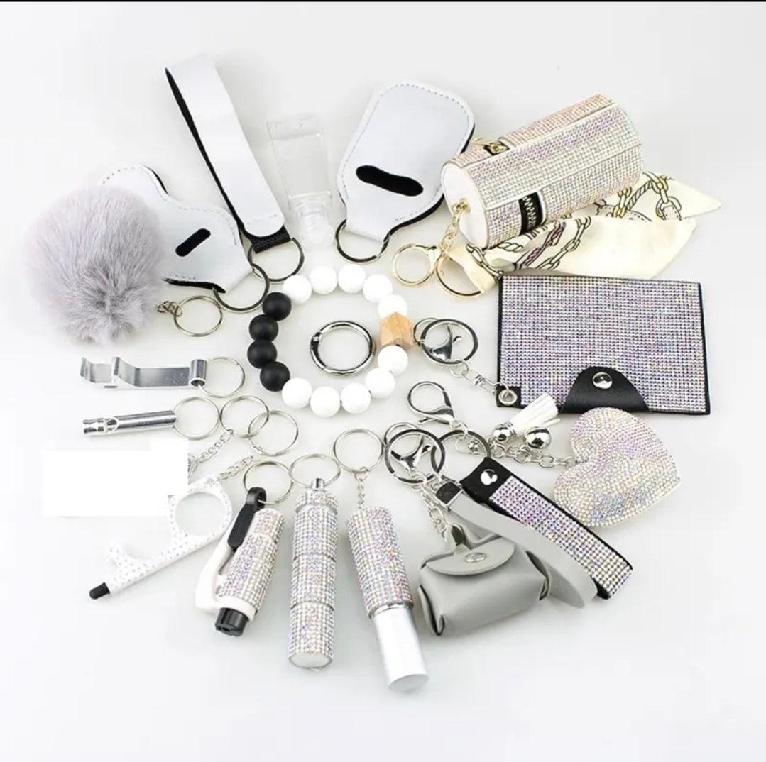 Elevate your everyday style and organization with our Deluxe Bling Keychain Set. This stunning 17-piece accessory collection combines functionality with flair, making it an essential item for those who appreciate both beauty and practicality. Designed to keep your essentials organized and accessible, this keychain set includes must-have accessories like a perfume/body spray bottle, a multi-section pill bottle, and a chic lippy/coin purse. Perfect for anyone on the go, this set will help you stay stylishly prepared.